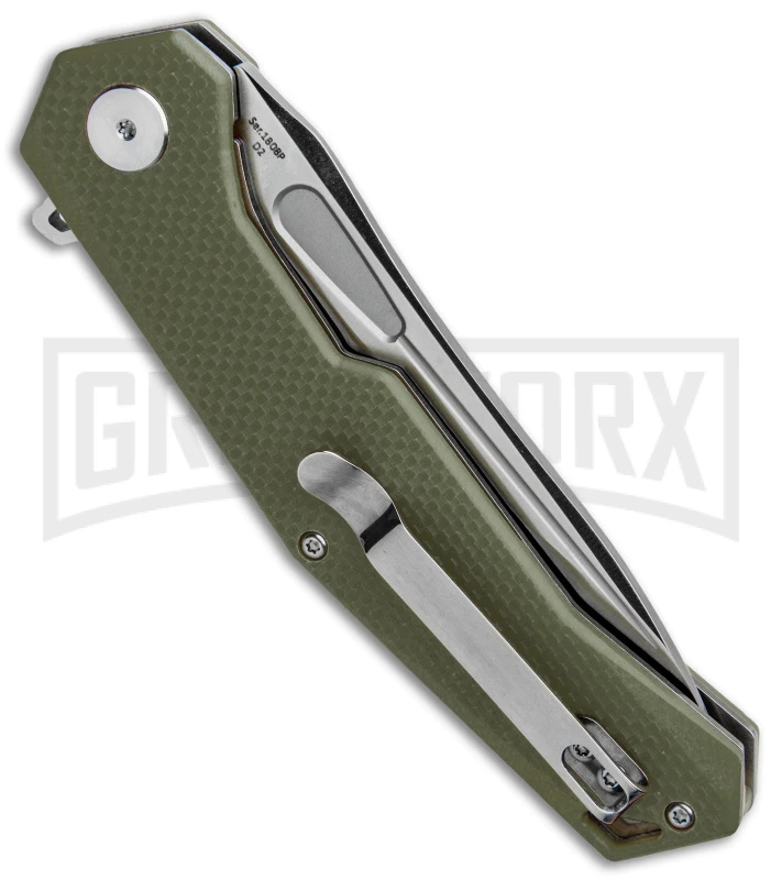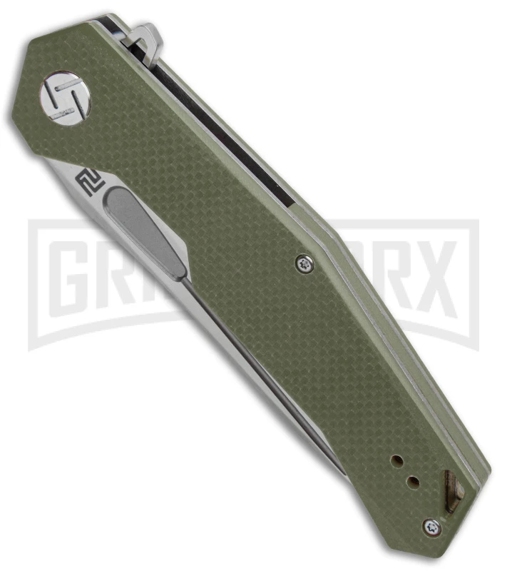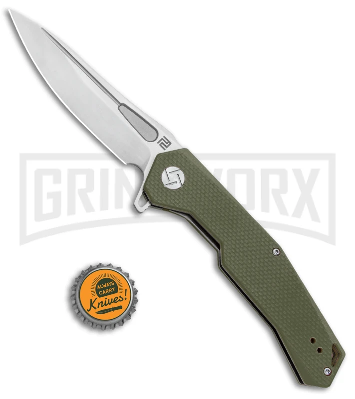 This Artisan Cutlery Zumwalt has a satin blade made from D2 steel and a textured green G-10 handle.