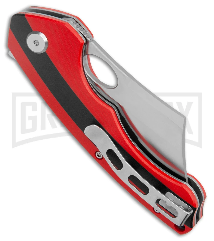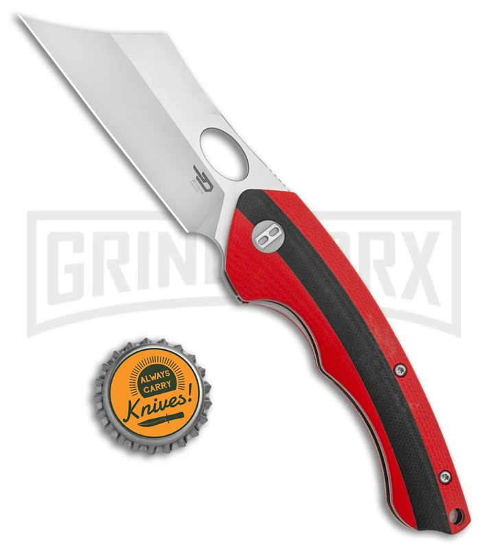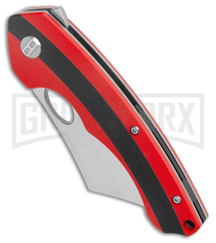 This Bestech Skirmish has an red and black G-10 handle and a satin blade.