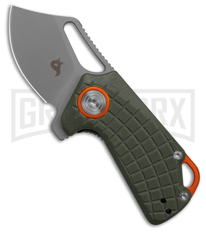 This BlackFox Puck red a G-10 handle in OD green and a bead blasted clip point blade.