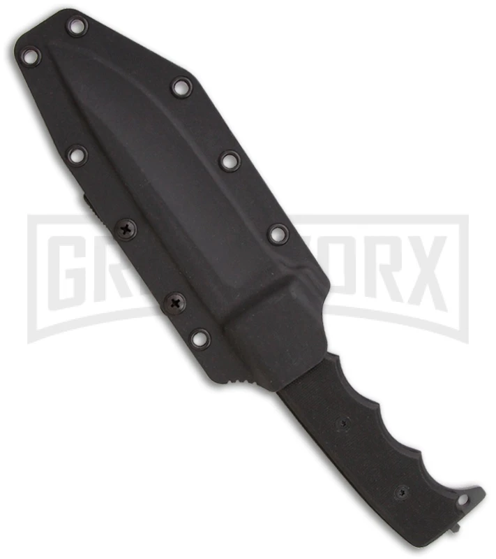The shark-like imposing Stone Cold features a hefty spear point blade crafted of matte black 440 stainless steel with a hollow grind, partial edge serrations, a pronounced front guard plus a squared pommel with a hardened glass breaking point. The finger-grooved handle is a full tang design and has black G10 scales. The matte black Blade-Tech molded polymer sheath allows you to position the Stone Cold at virtually any angle and mounts securely to your belt, web gear or tactical vest. Stone Cold means you’re ready for the heat of battle.