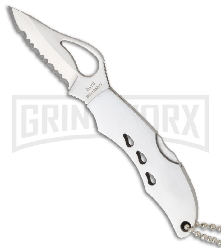 This Finch model is the smallest knife offered from Bryd Knives. The Finch features an 8Cr13MoV blade with serrated edge and a thumb hole opener. It has a stainless steel handle with a secure lockback mechanism. Item is outfitted with a bead ball chain for convenient EDC.
