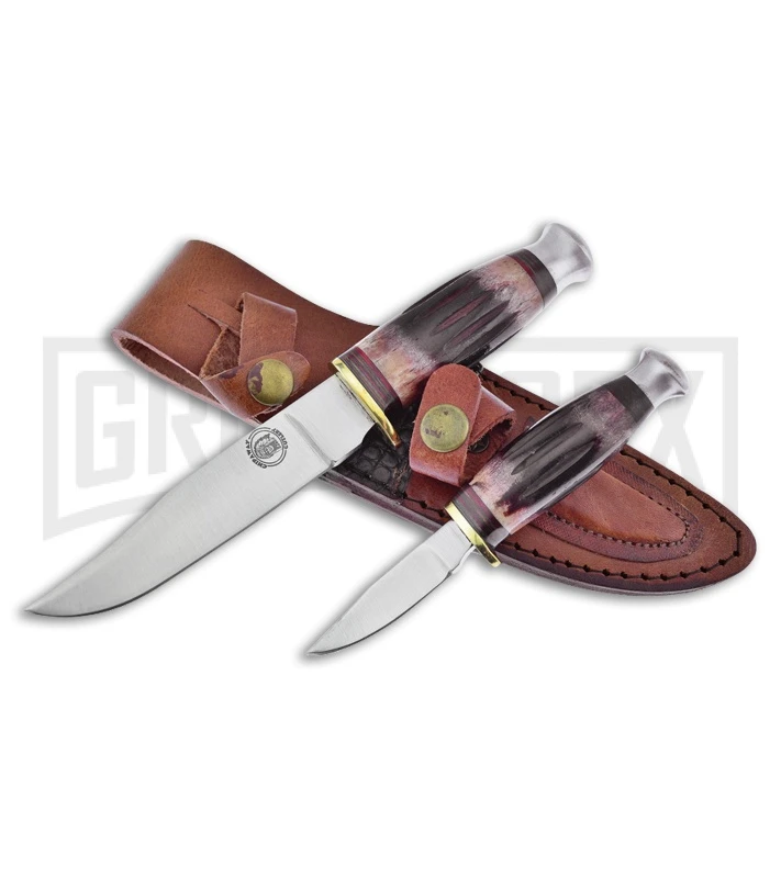 The Frost Cutlery Chipaway 2 Piece Set is a fixed blade knife set for camping or hiking. The stainless, clip point blades have satin finishes. The handles are made of red torch bone with brass guards, and stainless steel pommels. The set comes in a brown leather belt sheath.