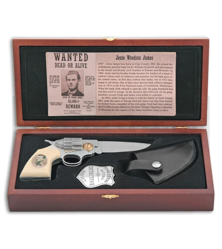 The Frost Cutlery Jesse James is a pistol shaped knife that commemorates Jesse James. The Jesse James features a satin finished, stainless steel, drop point blade with a nail nick opener. The pistol handle is constructed of stainless steel with imitation ivory grips featuring artwork of James. Secure and attach using the black imitation leather belt sheath. Comes in a wooden display box with badge and brief history of James.