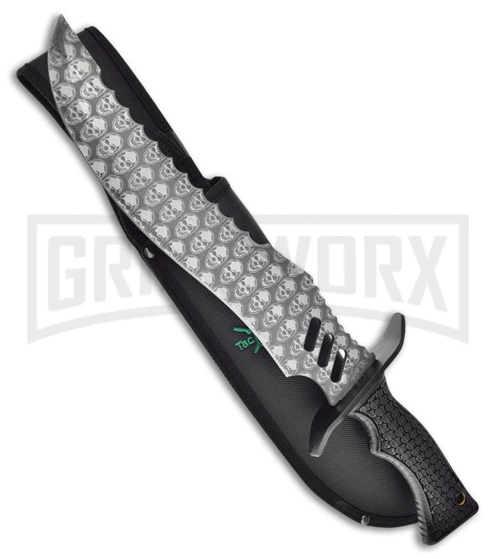 The Frost Cutlery Tac Assault Reaper is a fixed blade knife for your tactical needs, for showing it off to your friends, or killing zombies. It has a satin finished stainless steel, trailing point blade with a saw back edge and decorative skull artwork. The handle is made of textured black rubber with a stainless steel guard. It has a lanyard hole and comes with a black nylon belt sheath.
