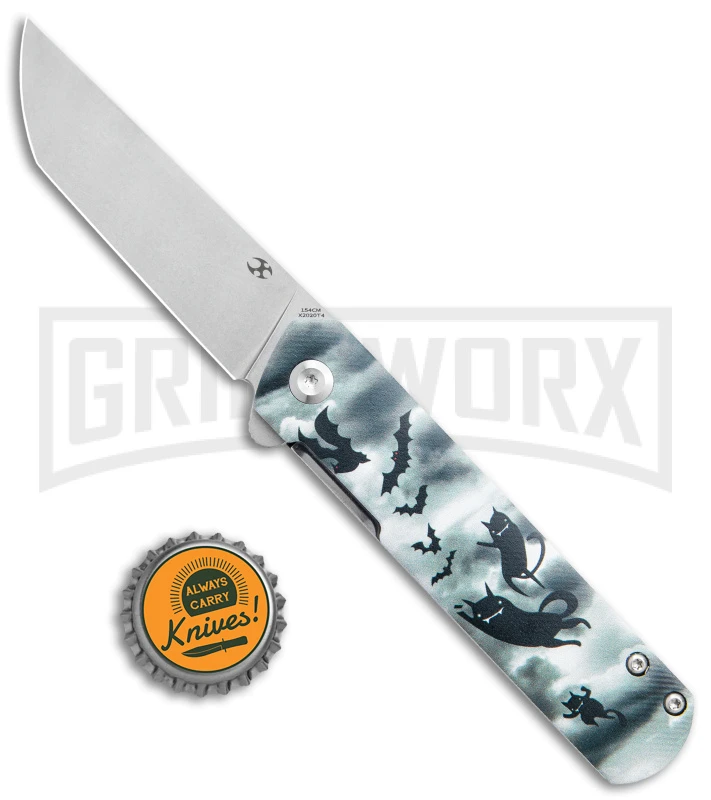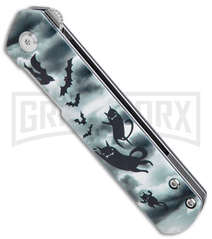 This Foosa model has a gray G-10 handle with a bats and cats print and a stonewashed blade.