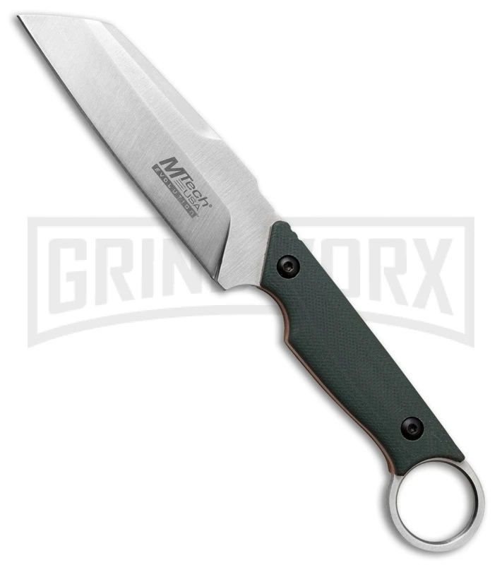 The M-Tech Evolution Quarrel is a fixed blade knife for tactical uses. The wharncliffe styled blade is made from 8Cr13MoV steel with a satin finish. The handle is green G-10 with a finger ring and has a full tang. This item can be carried with the black kydex belt sheath.
