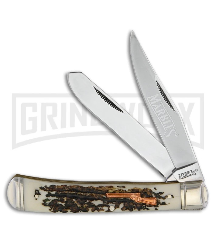 The Marble’s Trigger Lead Trapper is a manual folding traditional pocket knife for everyday carry. The stainless steel clip point and spey blades have satin finishes, and nail nick openers. The handle is made of polymer designed to look like stag antler that features nickel silver bolsters and an inlay shield. Like most traditional pocket knives, it has a slip joint.