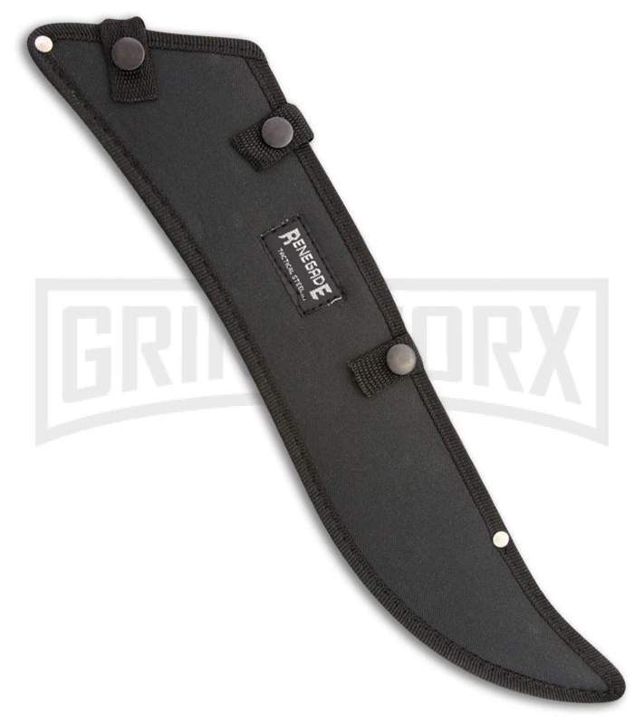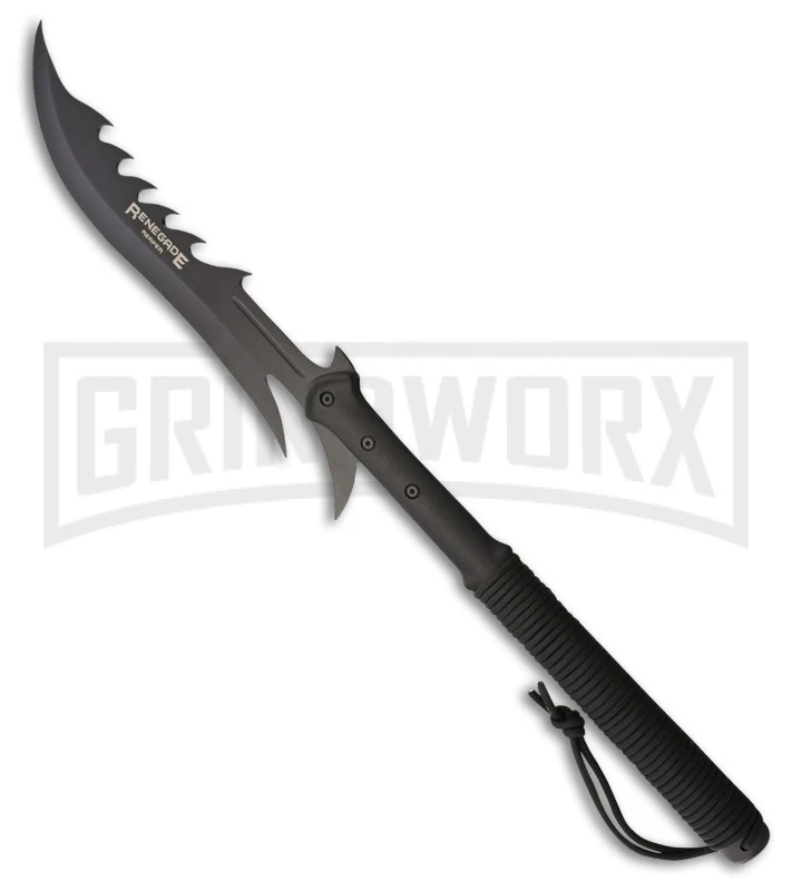 The Renegade Tactical Steel Reaper is a machete for adding to your collection or using on your next undercover operation. The 3Cr13 stainless steel, trailing point blade has a black finish, a sawback, and sharp points near the handle acting as guards. The handle is made of black GFN wrapped in black nylon cord. It has a lanyard hole and comes with a black nylon belt sheath.