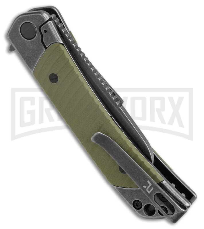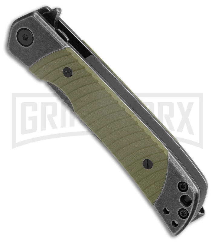 This knife has a green handle with a black stonewash finished sheepsfoot blade.