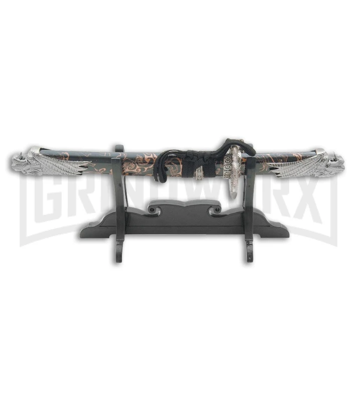The Rite Edge Mini Dragon is a miniature size katana, ideal for novelty and recreational uses. The Mini Dragon features a satin finished, stainless steel blade. The black and gold composite swirl handle features a black finished, cast metal tsuba and pommel. Secure the blade using the matching scabbard and store on the black finished, wood tabletop display stand.
