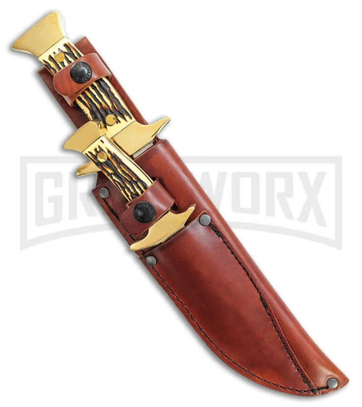 The Schrade Uncle Henry 2 Piece Bowie Set includes a pair of fixed blade knives for hunting. The full tang 7Cr17MoV stainless steel, clip point blades have satin finishes. The handles are made of polymer that feature brass guards and pommels. They come with a brown leather belt sheath.