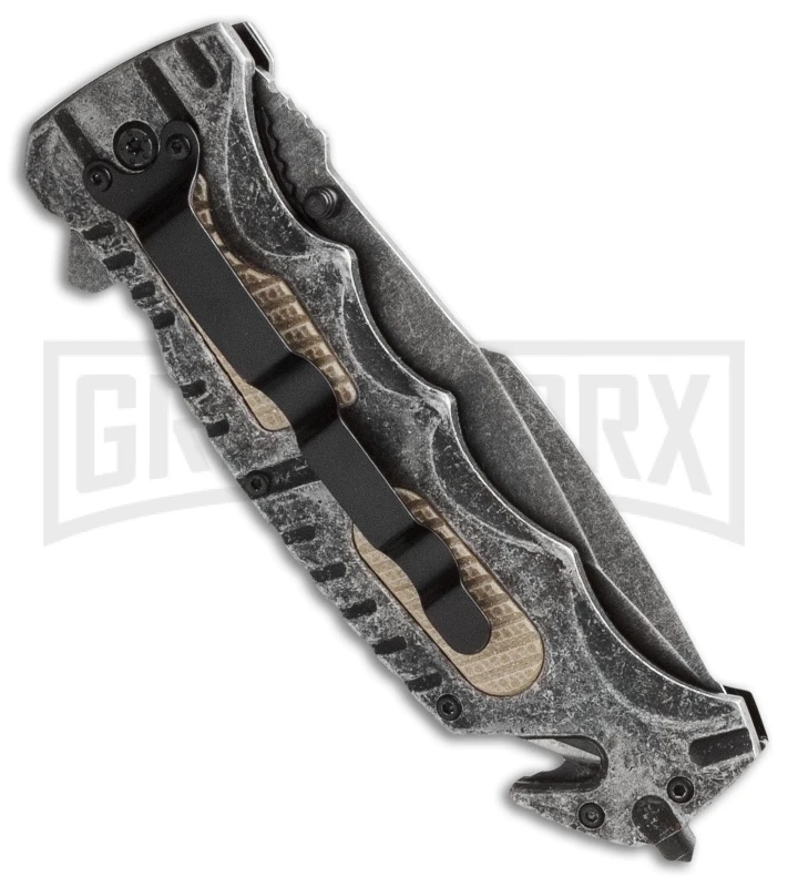 The SWBG8TS model has a partially serrated, black stonewashed tanto blade with thumb stud openers. A steel liner lock snaps into place, keeping the blade secure during use. The huge handle is skeletonized, keeping weight down, and includes tan G-10 inserts front and back. In addition, the handle has a built-in strap/belt cutter and an enormous clip is mounted on back to keep this folder in your pocket and ready at a moment’s notice.
