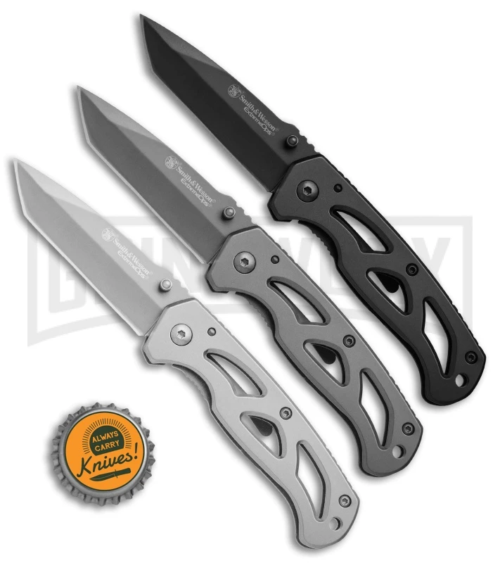 The Smith & Wesson 3 Piece Combo pack includes three high quality folding knives for 1 low price. It features 3 Stainless steel folding knives with 2.75″ blades and plain cutting edges. They have skeletonized stainless steel handles for lightweight strength and a superior grip. Each knife comes equipped with a stainless steel pocket clip for comfortable EDC.