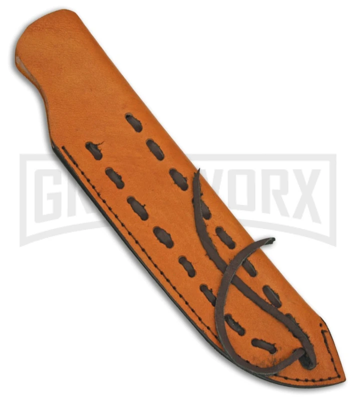 The Tallen Apache Bowie is a large, fixed blade knife that makes skinning and dressing your game feel easy. The Apache Bowie features a satin finished, carbon steel, clip point blade. The handle is made of white smooth bone with a carbon steel bolster. Carry and attach using the brown leather belt sheath with decorative cord trim.