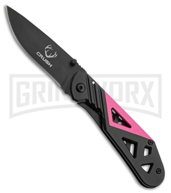 The Utica Cutlery Crush Air is a spring assisted knife for everyday carry. The 420 stainless steel blade has a black finish with a thumb stud opener. The handle is black and pink aluminum with cutouts.