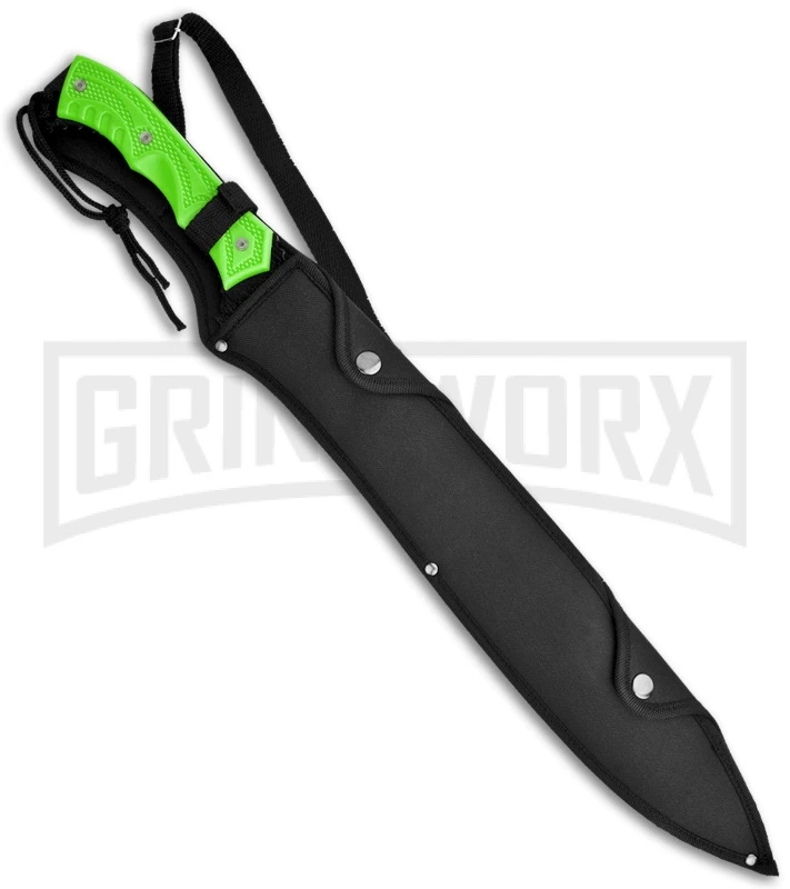 The Biohazard Zombie Wilderness machete from Wartech is the ultimate apocalyptic survival gear. From bushwacking through a post-apocalyptic wilderness to protecting yourself from the living dead, this machete is the blade to do it. The fixed blade features a full tang of stainless steel, molded textured green scales that provide superior grip and comfort, and lanyard. The blade has a compound bevel grind and a scalloped edge along its spine. A must have for any survival gear! Includes nylon sheath.
