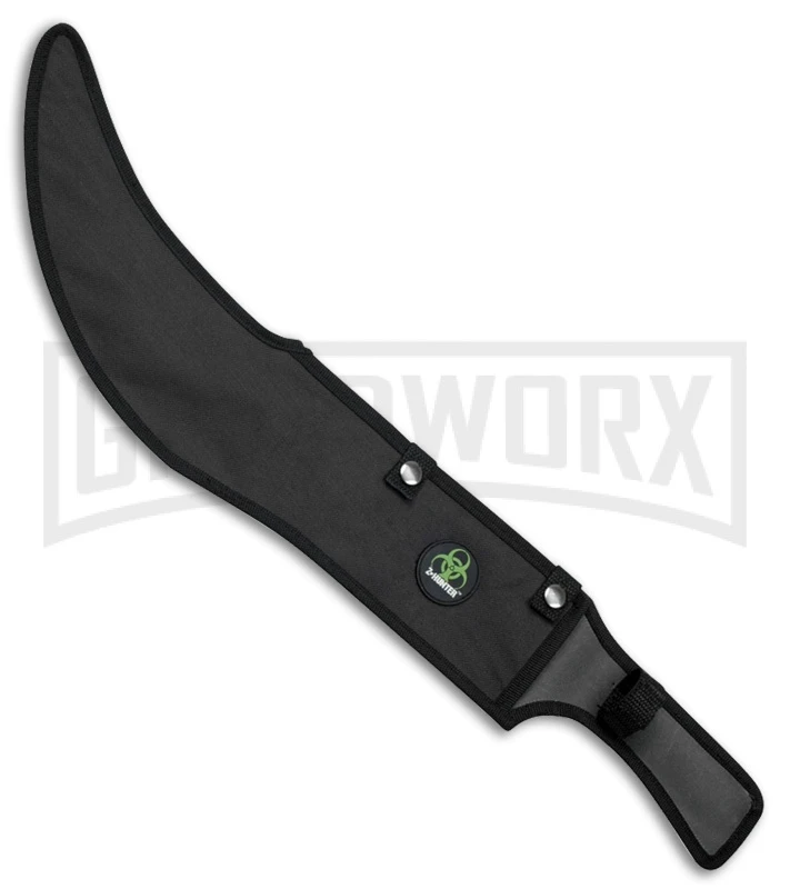 The Z-Hunter Annihilator is a machete for tactical use. This vicious blade will scare the zombies away like no other blade ever could. It’s definitely the one you want to carry on your next excursion. The partially serrated, stainless steel blade has a two-toned black and satin finish. It features a trailing point blade style, sawback, hooks and a slot cutout design. The black handle which is part of the full tang is wrapped in neon green nylon cord and has a lanyard slot and hole. Included is a black nylon belt sheath with a rubber patch logo and an adjustable shoulder strap.